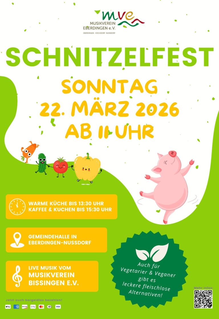 Am 22. März 2026 laden wir Sie herzlich zu unserem alljährlichen Schnitzelfest in die Gemeindehalle in Nussdorf ein. Der Musikverein Eberdingen freut sich darauf, Sie ab 11:00 Uhr mit kulinarischen Leckerbissen und musikalischer Unterhaltung zu verwöhnen.